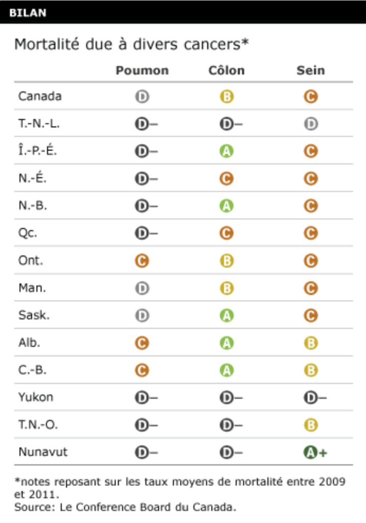 Avec les plus faibles taux de mortalité du pays, la Colombie-Britannique et l’Alberta sont les deux seules provinces à décrocher un « A » en ce qui a trait à la mortalité due au cancer. La plupart des provinces obtiennent un « B » ou un « C ». Terre-Neuve-et-Labrador, qui obtient un « D », est la plus mal classée. C’est dans les territoires que les taux de mortalité due au cancer sont les plus élevés au Canada.