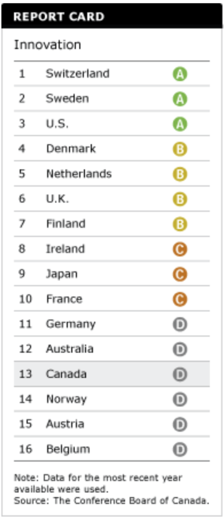 Canada performs poorly on most indicators, scoring 13 “D”s, 2 “C”s, 6 “B”s, and no “A”s. The “D” grades underline Canada’s relative weakness in all three categories of the innovation process—creation, diffusion, and transformation.