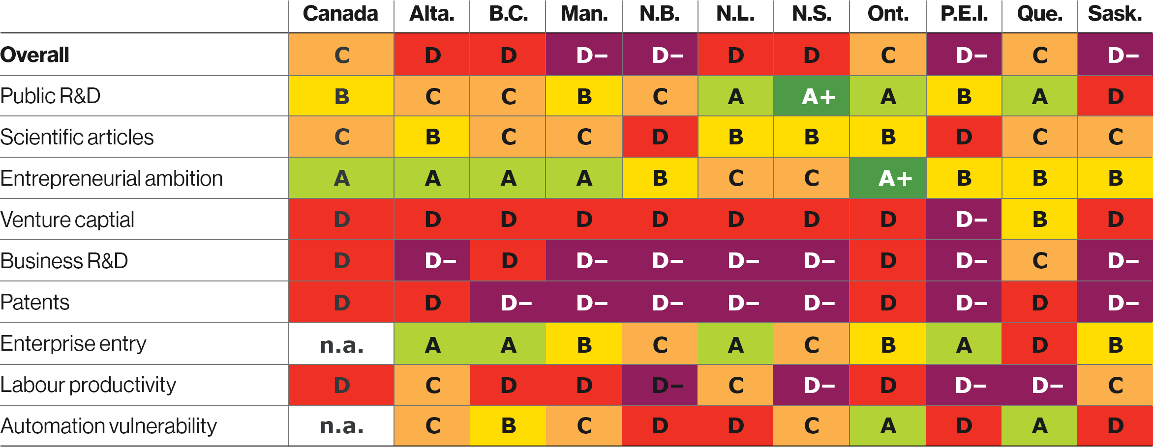 New Brunswick, Prince Edward Island, Saskatchewan, and Manitoba remain the lowest-ranked provinces, receiving D– grades.