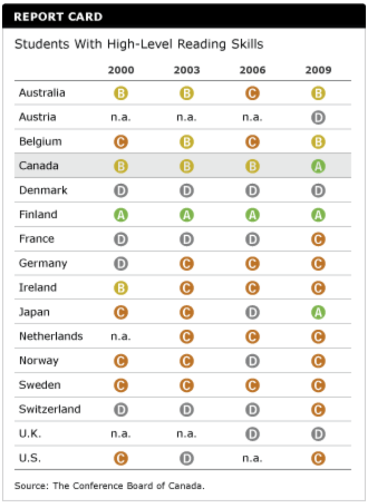 - Despite the smaller share, Canada moved from a “B” in the 2006 test to an “A” in 2009. This is because Finland, the top performer, also had a lower share of students with high-level reading skills in 2009.