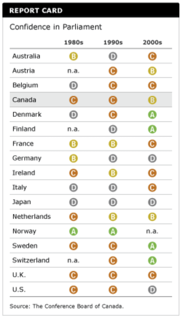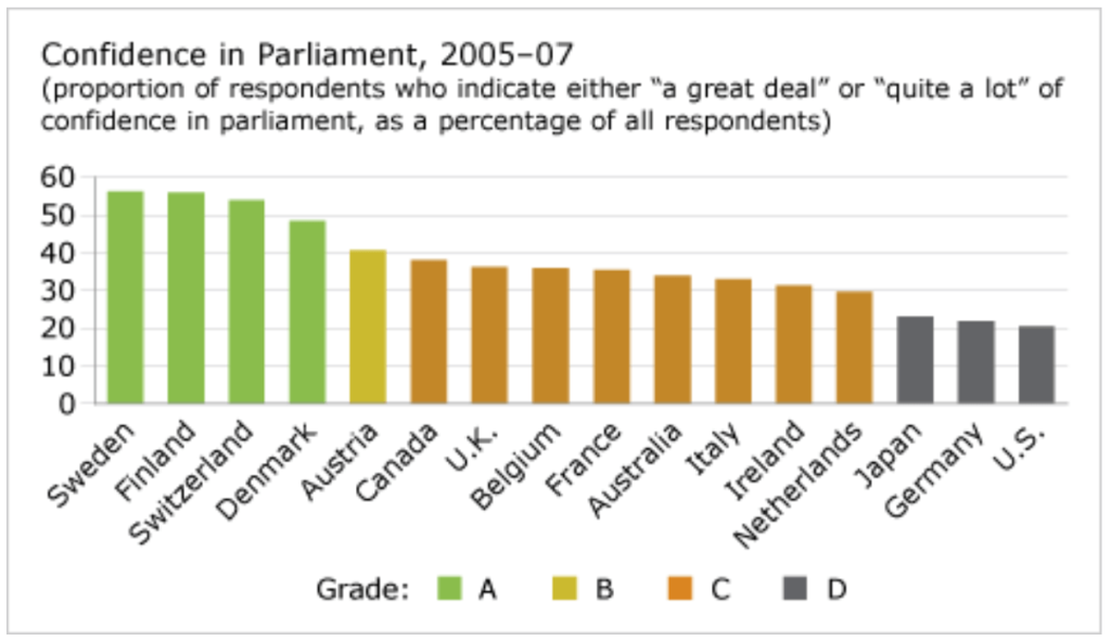 There are extreme variances between peer countries in the level of confidence people have in their parliaments. The highest recent recorded confidence level is in Sweden, with almost 54 per cent of people saying they had “a great deal” or “quite a lot” of confidence in parliament. The lowest recent recorded confidence level is in the U.S., with only 21 per cent responding positively about their parliament. The proportion of Canadian respondents reporting a high level of confidence in parliament is 38 per cent, giving Canada a “C” on this indicator.